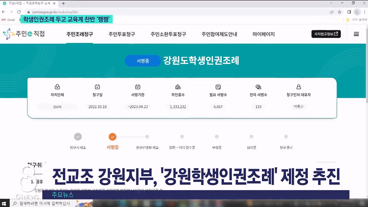 강원학생인권조례 제정을 위한 주민조례청구는 내년 4월까지 주민 서명을 받아, 도의회에 제출되면 의회에서 심의 의결을 거쳐 결정됩니다.