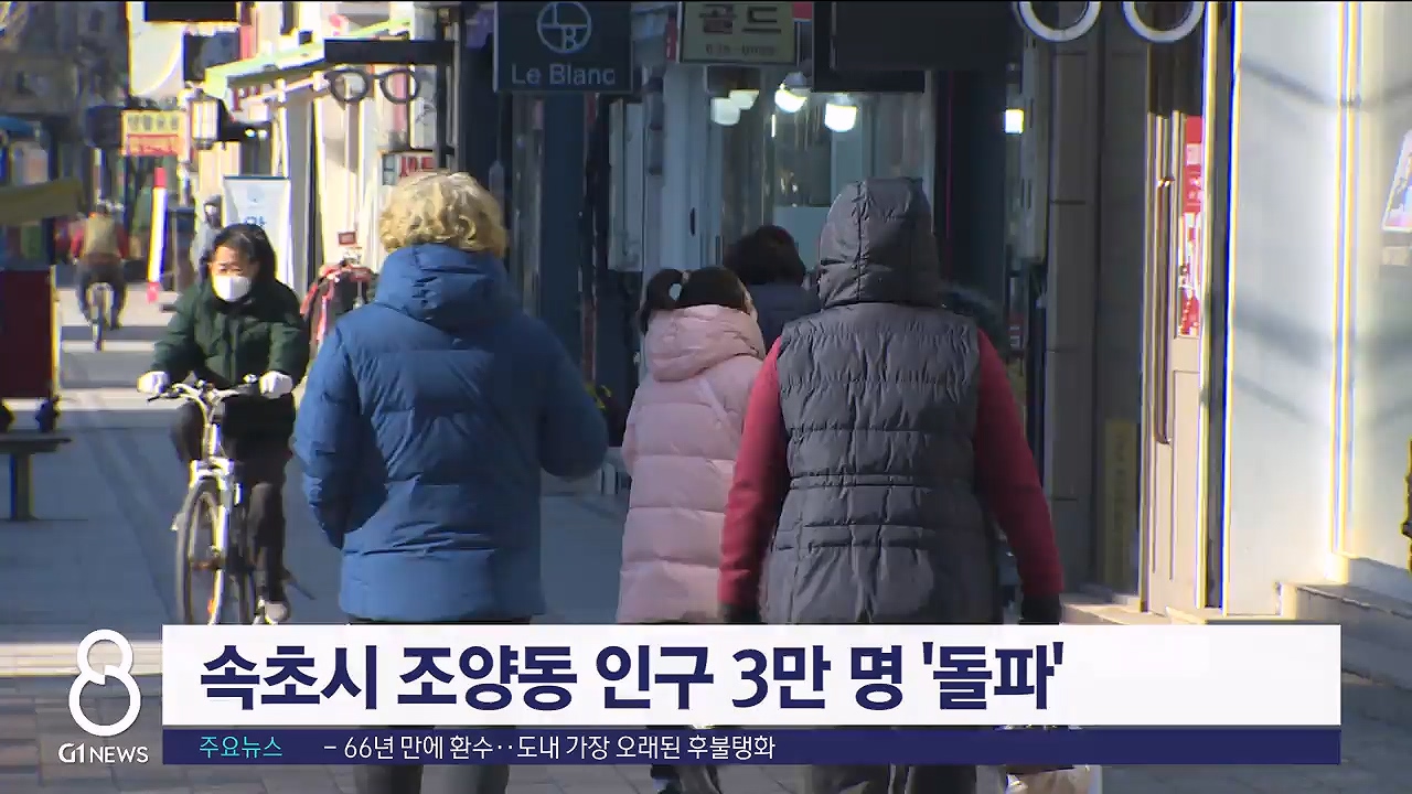 속초시는 14일 기준 조양동 인구가 3만 11명으로 속초 전체 인구의 36.4%를 차지하고, 인근 고성군과 양양군 인구보다 많다고 밝혔습니다.