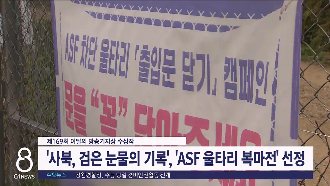 G1방송이 기획 보도한 '사북, 검은 눈물의 기록'과 'ASF 울타리 복마전: 2천억은 어디로 갔나'가 제169회 이달의 방송기자상 지역기획보도부문 공동 수상작으로 선정됐습니다.