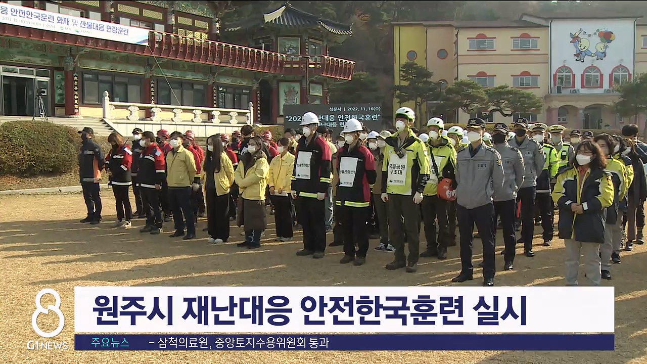 2022 재난대응 안전한국훈련이 전국에 걸쳐 진행 중인 가운데 원주시와 원주지역 공공기관이 참여하는 대규모 합동훈련이 오늘(16일) 행구동 성문사에서 진행됐습니다.