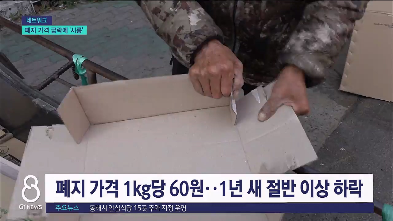 경기 침체로 수출이 급감하고 국내 박스 사용량도 줄면서 폐지 유통 자체가 원활하지 않다고 합니다.
