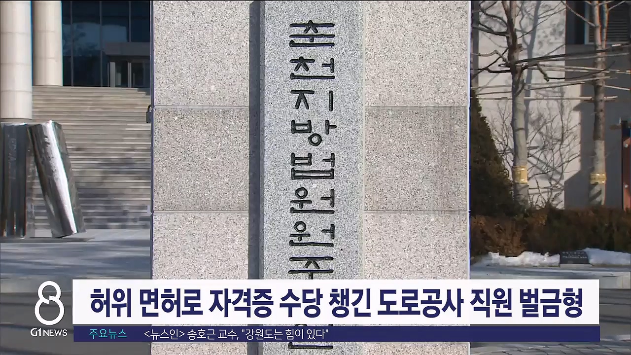춘천지법 원주지원 형사1단독 공민아 판사는 위계공무집행방해 및 건설기계관리법 위반, 사기 등의 혐의로 기소된 한국도로공사 직원 43살 A씨에게 벌금 400만 원을 선고했습니다.