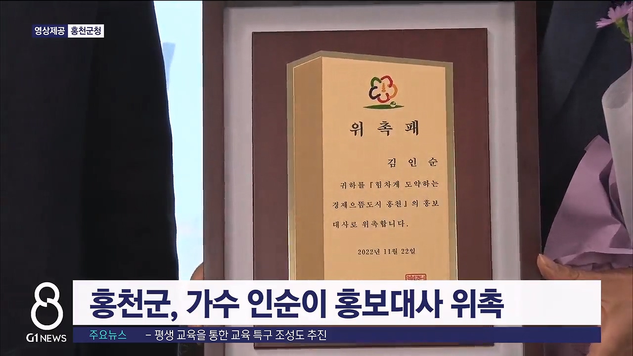 홍천군은 오늘(22일) 홍천군청에서 인순이 씨에게 홍보대사 위촉장을 수여했습니다.