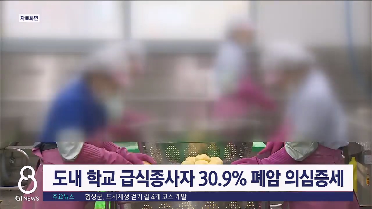 도내 학교 급식종사자 천7백여 명 중 30.9%, 544명이 폐결절 양성반응 등 폐암 의심 증세를 보이는 것으로 조사됐습니다.