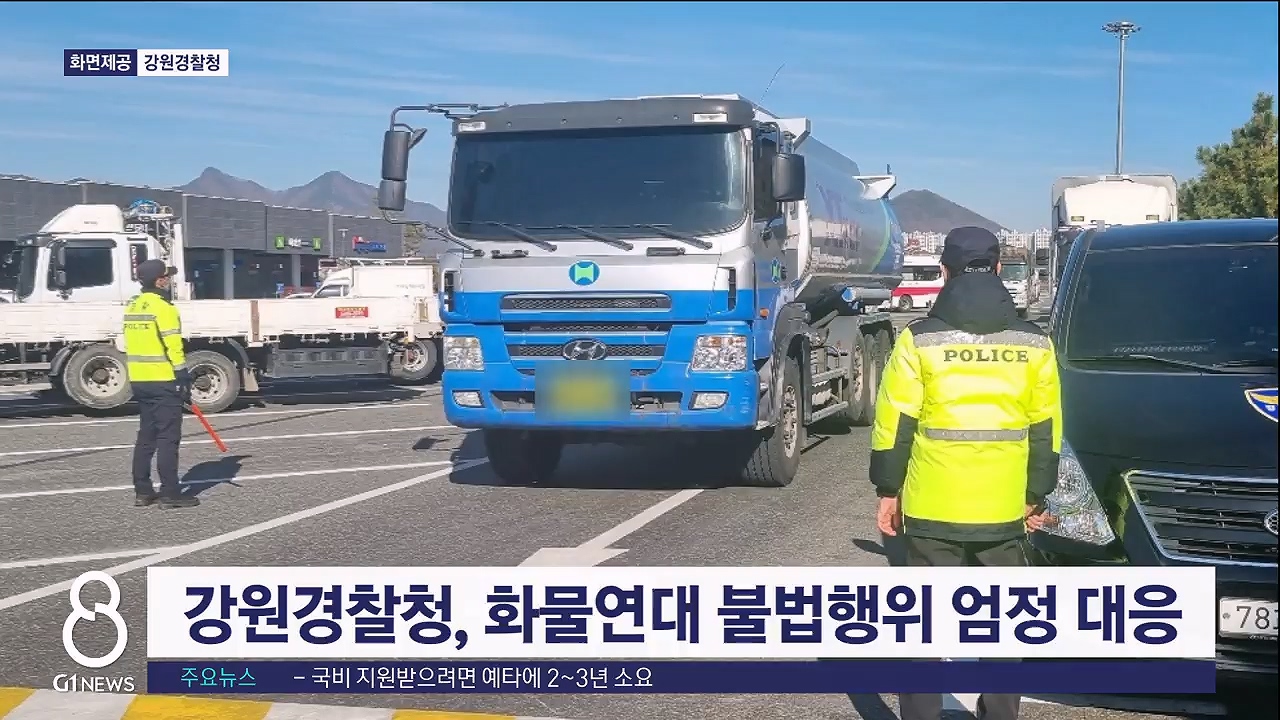 강원경찰청이 파업에 나선 민주노총 화물연대의 고속도로상 운송방해 등 불법행위에 대해 엄정 대응하기로 했습니다.