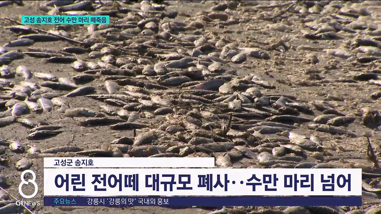 호숫가 빼곡히 어린 전어떼가 죽은 채 떠밀려와 있습니다.