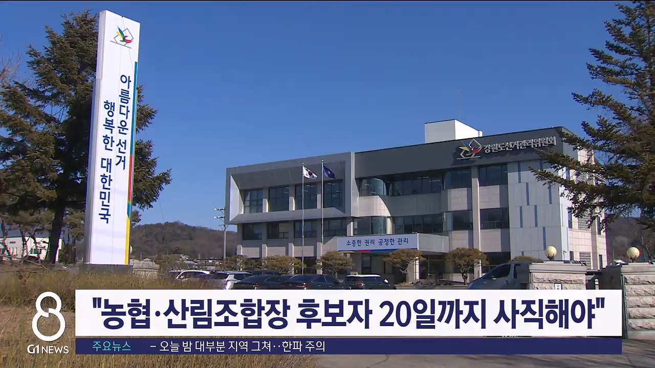 강원도선거관리위원회는 내년 3월 8일 실시하는 제3회 전국동시조합장선거에 출마할 공무원과 조합의 임·직원 등은 농협·산림조합은 오는 20일, 수협은 내년 1월 19일까지 직을 그만둬야 한다고 밝혔습니다.