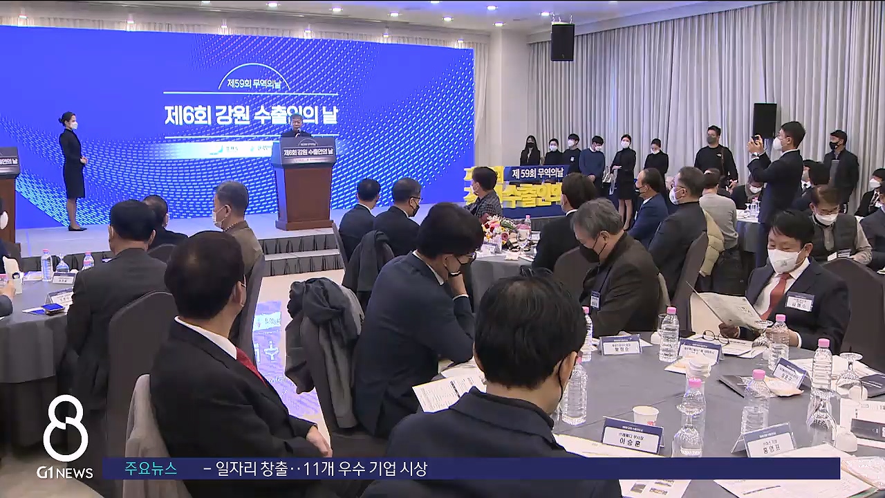 수출 수상 기업과 유공자들이 참석한 기념식에서 강원 수출대상은 파마리서치 등 11개 기업이 받았고, 중앙수출의 탑은 더마펌 등 20개 기업이 수상했습니다.