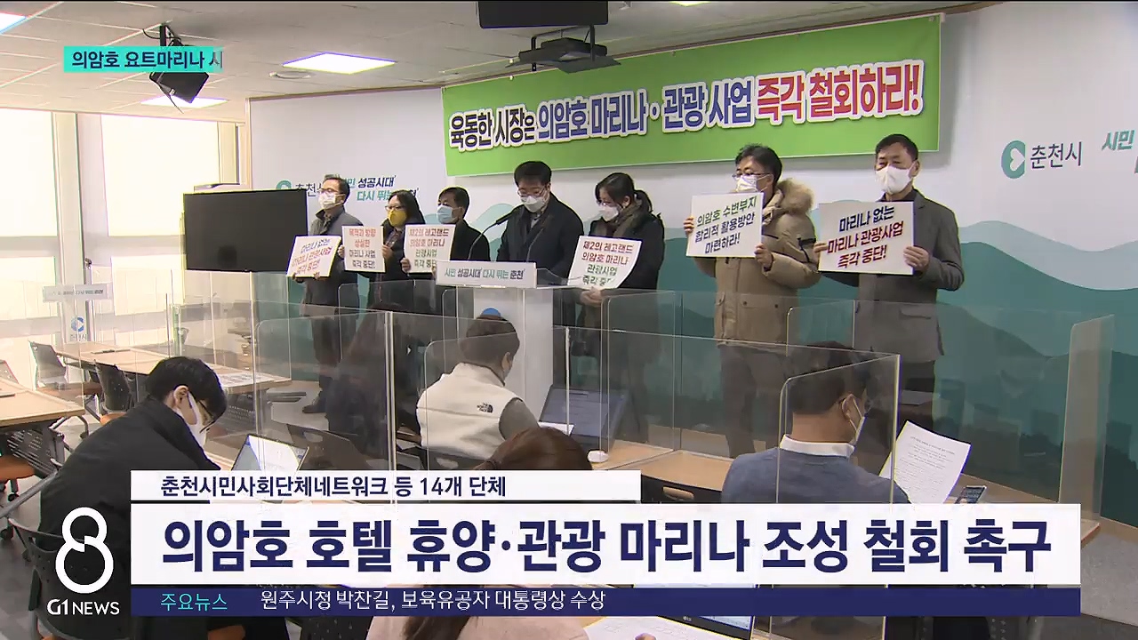 춘천지역 14개 시민사회단체와 정당 관계자들이 '춘천 의암호 호텔 휴양·관광 마리나 조성 사업' 철회를 촉구하고 나섰습니다.