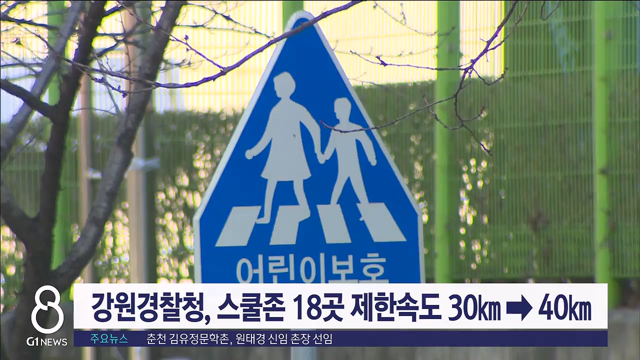 강원경찰청이 교통량과 지역 여론 등을 종합적으로 검토해 보행자 사고 위험이 낮은 어린이보호구역 18곳의 제한속도를 시속 40km로 상향한다고 밝혔습니다.
