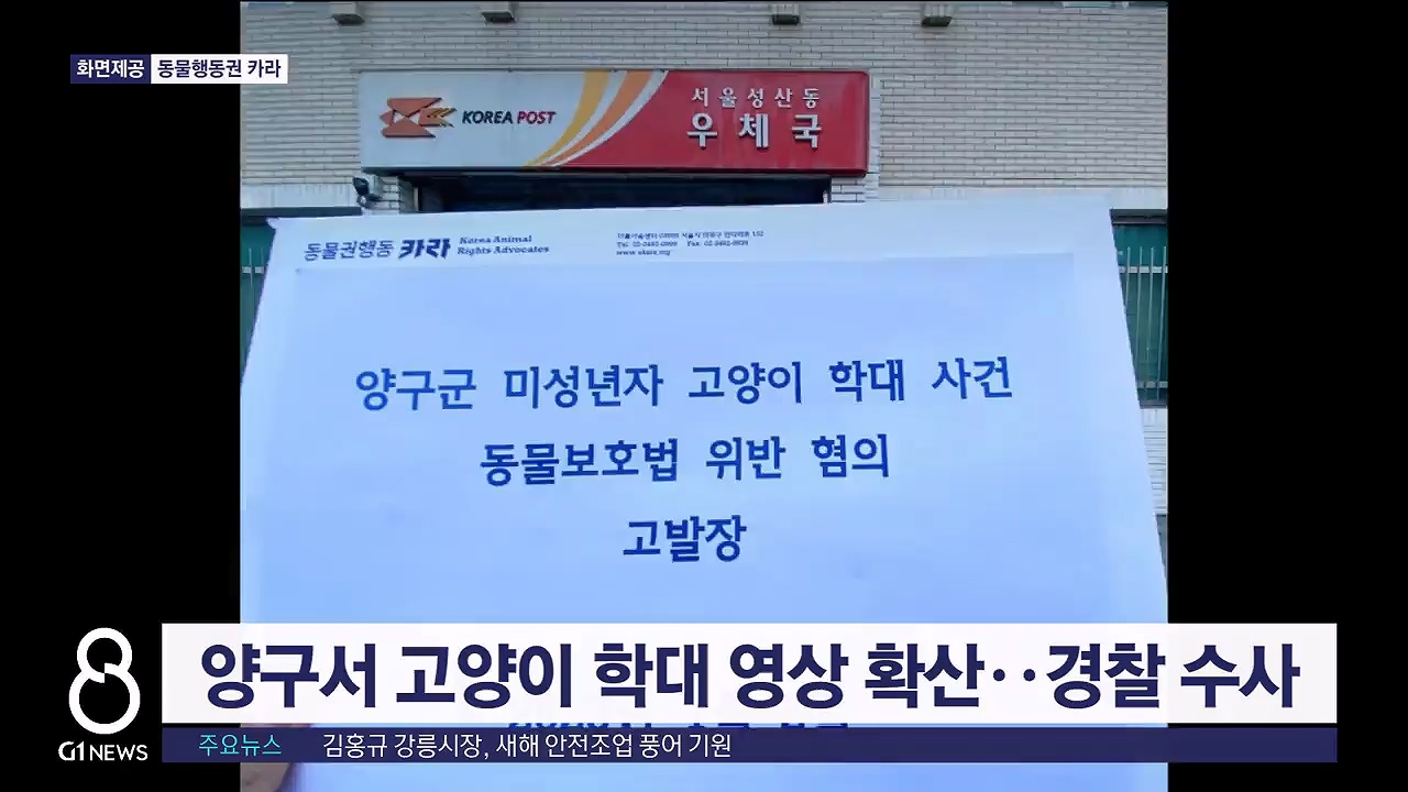 동물보호단체 '동물권행동 카라'는 고양이를 학대하는 가해자를 동물보호법 위반 혐의로 어제(2일) 양구경찰서에 고발했다고 밝혔습니다.