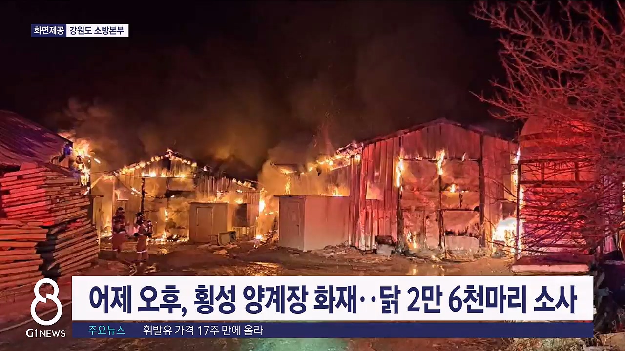 어제 저녁 횡성 양계장 화재‥닭 2만 6천마리 소사