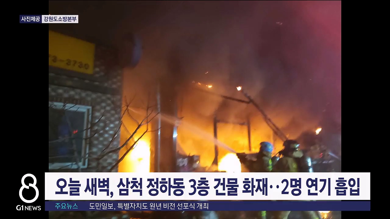 오늘 새벽 0시 58분쯤 삼척시 정하동 한 3층 건물에서 불이나, 50대 남녀 2명이 연기 흡입 증세로 병원으로 이송됐습니다.