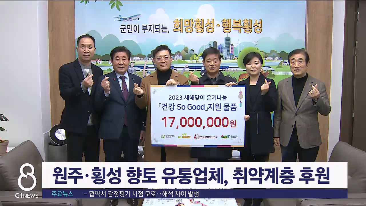 원주와 횡성지역 향토 유통업체 관계자들은 오늘(12일) 김명기 횡성군수를 통해 굿네이버스 강원지역본부에 천7백만 원 상당의 후원 물품을 기탁했습니다.