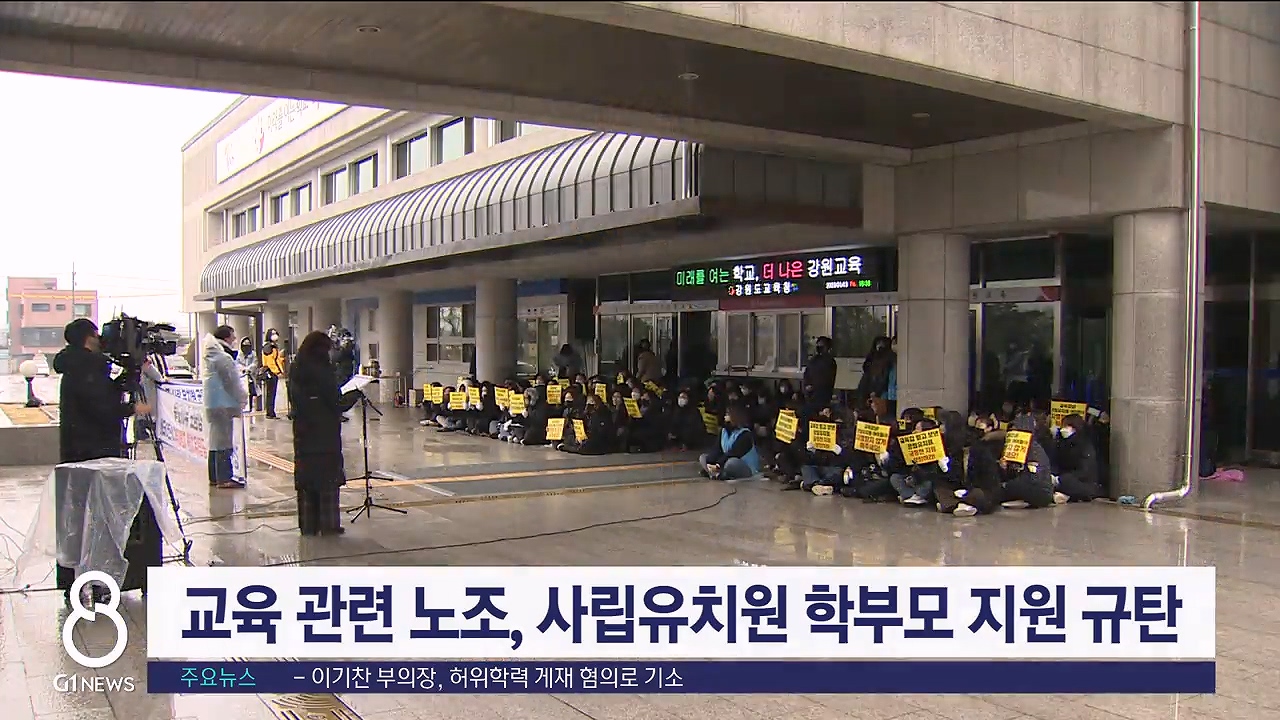 강원도 교육청이 지난해 9월부터 시행 중인 '사립유치원 학부모 부담금 지원 정책'을 규탄하는 결의대회가 오늘(13일) 도 교육청 앞에서 열렸습니다.