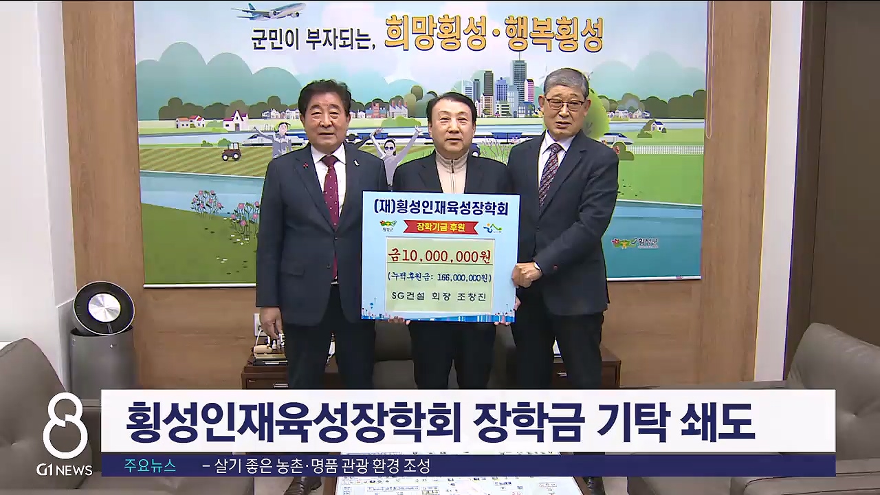 지역 향토 건설사가 오늘(18일) 횡성 군수 집무실에서 횡성인재육성장학회에 장학금 천만 원을 기탁한 것을 비롯해,