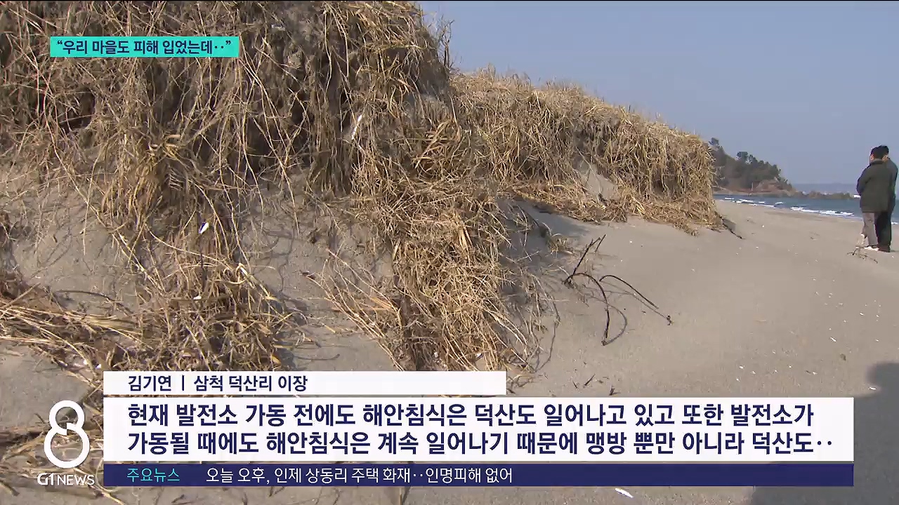 "현재 발전소 가동 전에도 해안 침식은 덕산도 일어나고 있고 또한 발전소가 가동 될 때에도 해안침식은 계속 일어나기 때문에 맹방 뿐만아니라 덕산도..."