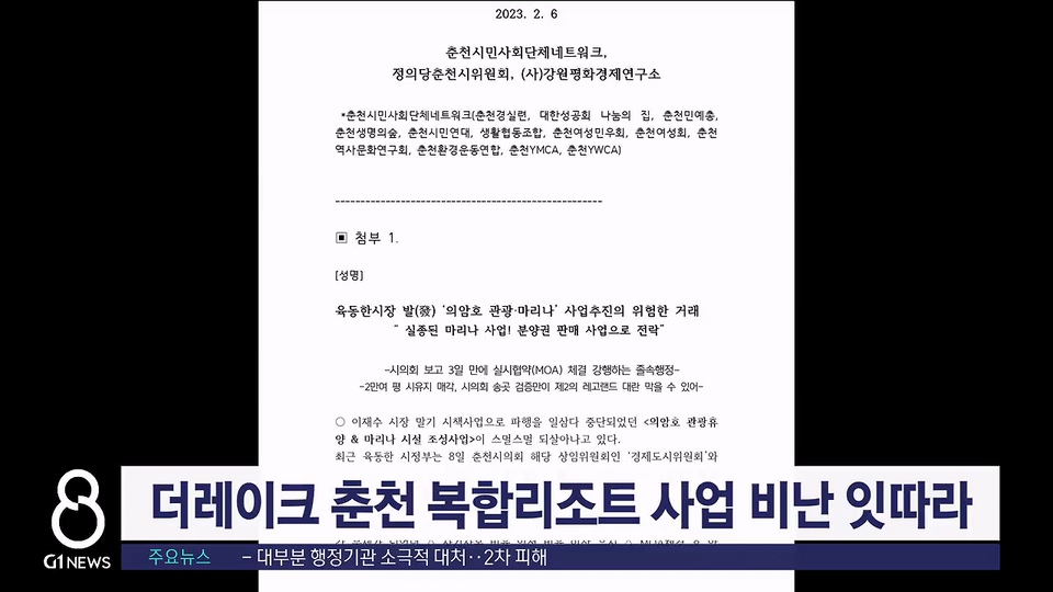 춘천시가 역점 추진 중이 '더레이크 춘천 복합리조트 사업'과 관련해 정치권과 시민사회단체의 비난이 잇따르고 있습니다.