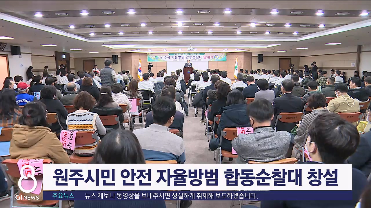원주시는 오늘(7일) 시청 다목적홀에서 원주시 자율방범 합동순찰대 발대식을 열고, 안전 도시 원주 만들기를 위한 결의를 다졌습니다.