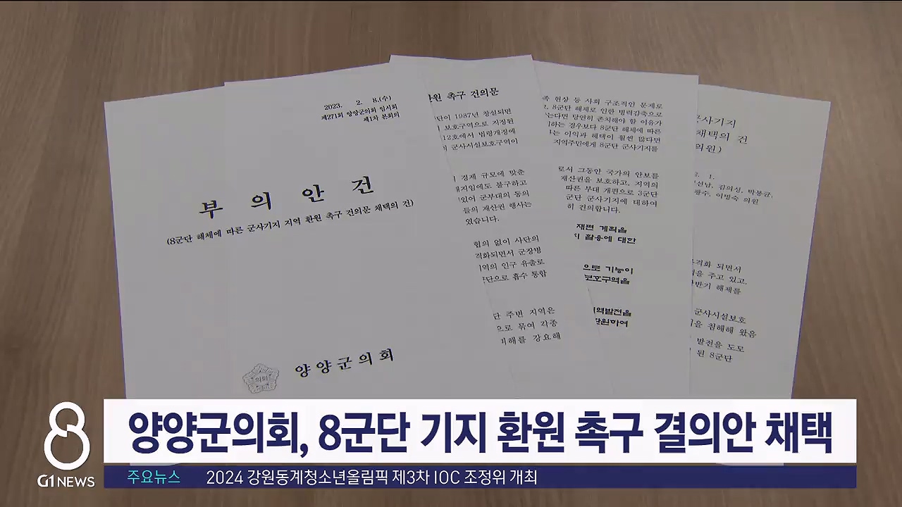 양양군의회는 김의성 의원이 대표발의한 8군단 해체에 따른 군사기지 지역 환원 촉구 결의안을 만장 일치로 채택했습니다.