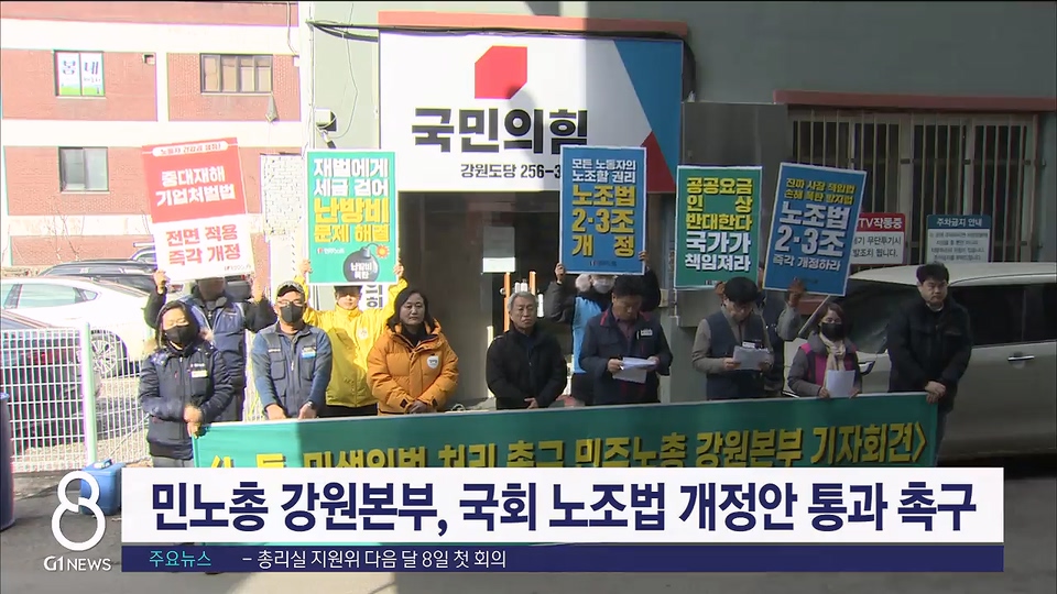 민주노총 강원본부는 오늘(14일) 국민의힘 강원도당 앞에서 기자회견을 열고 "국회 환경노동위원회 위원들은 노조법 2조와 3조 개정안을 반드시 통과시켜야 한다"고 주장했습니다.
