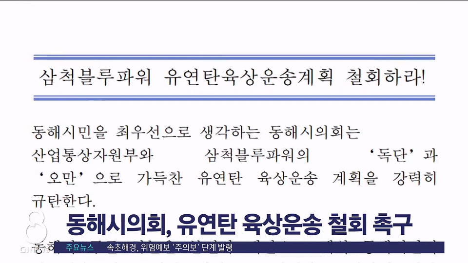 동해시의회는 오늘(14일) 성명서를 내고, "삼척블루파워가 동해시의 환경기본정책을 정면으로 위협하고 있다"며 "유연탄 육상 운송 계획을 강력히 규탄한다"고 밝혔습니다.