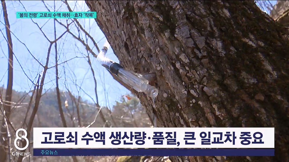 "작년에는 날씨가 많이 추워서 2월 달에는 (수액이) 아예 나오지 않고 3월 달부터 채취를 했는데, 올해 같은 경우는 날씨가 많이 따뜻해지고 눈도 많이 와서 채취량이 2배 정도는 가능할거라고.."