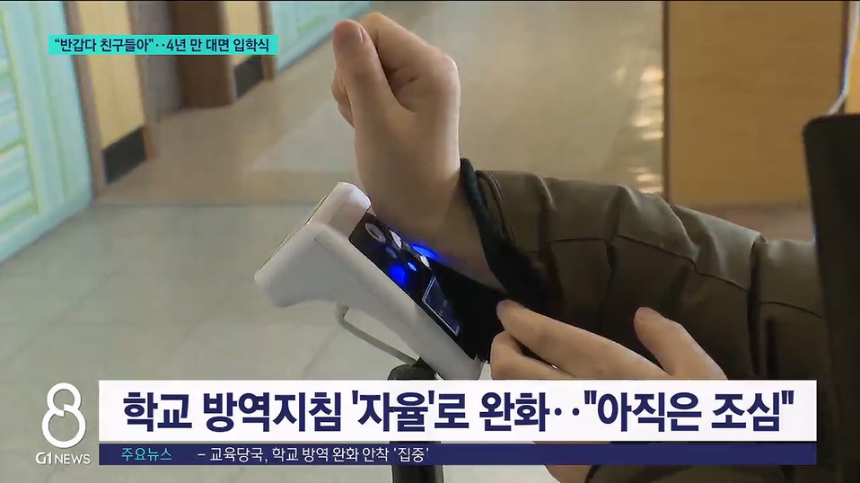 학교 내 방역 지침이 자율로 대폭 완화됐지만, 여전히 발열 체크와 손소독 등 기본 방역에는 신경쓰는 분위기였습니다.