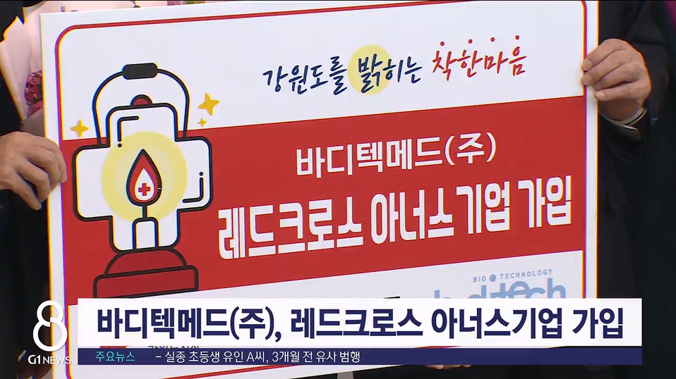 대한적십자사 강원도지사가 오늘(13일) 강원도청에서 바디텍메드 주식회사의 대한적십자사 레드크로스 아너스기업 가입식을 가졌습니다.