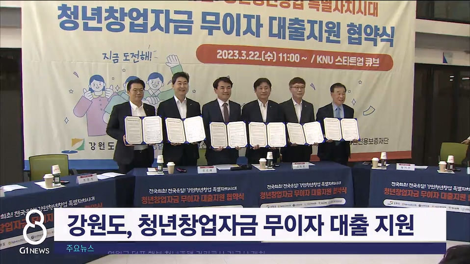 강원도와 4개 금융기관, 강원신용보증재단은 KNU 스타트업 큐브에서 업무협약을 맺고 도내 청년들에게 창업자금을 최대 5,000만 원까지 5년간 무이자 대출하기로 했습니다.