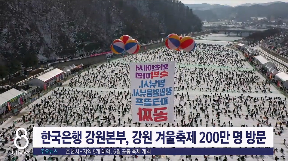 한국은행 강원본부에 따르면, 올해 화천 산천어 축제 131만 명, 평창 송어 축제 40만 명, 인제 빙어축제 20만 명, 홍천강 꽁꽁축제에 15만 명 등이 방문했습니다.