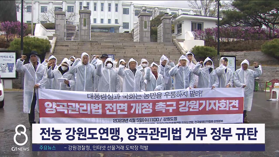 전국농민회총연맹 강원도연맹은 오늘(05일) 강원도청 앞에서 기자회견을 열고 양곡관리법 거부권을 행사한 정부를 규탄했습니다.