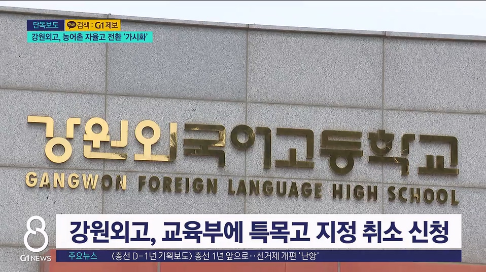G1 뉴스에서는 어제 양구 강원외고가 특목고 지위를 포기하고 농어촌 자율고로 전환을 추진중이라는 소식 전해드렸는데요.