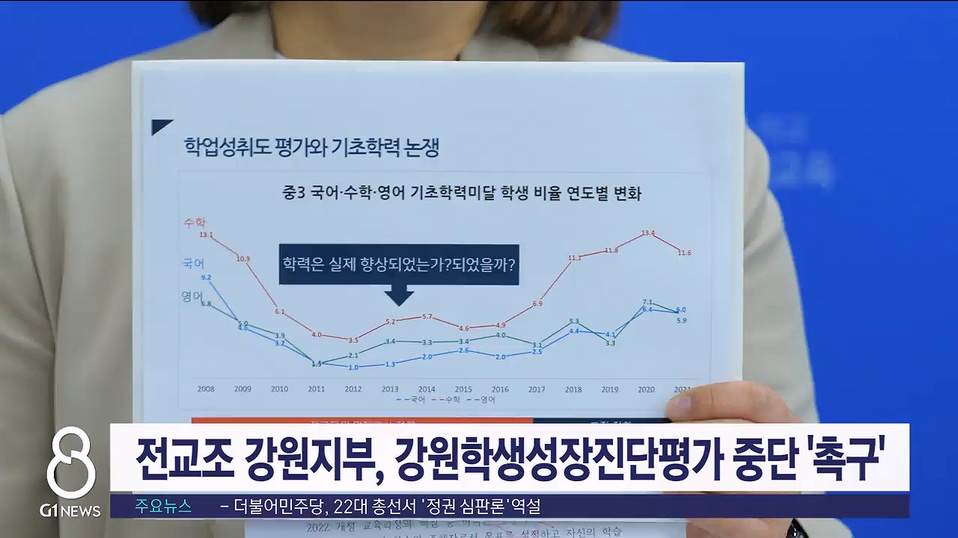 전교조 강원지부를 비롯한 교사단체는 오늘(13일) 도 교육청에서 기자회견을 열고 7월 치러지는 강원학생성장진단평가를 중단할 것을 촉구했습니다.