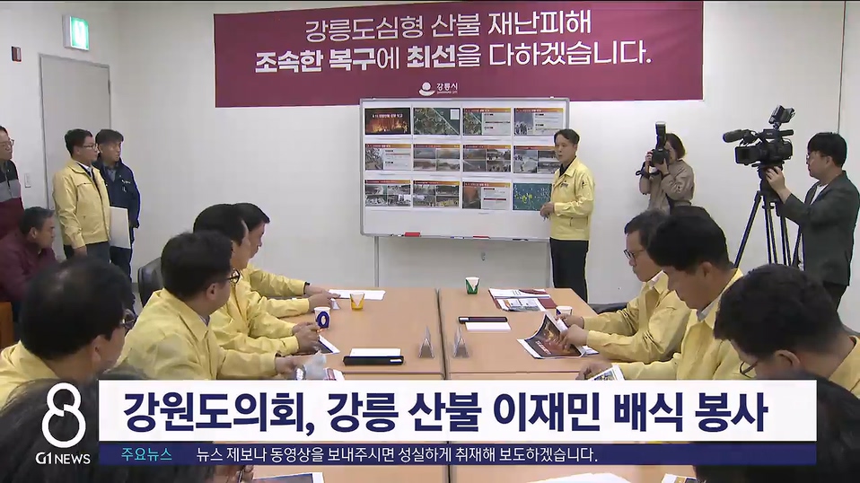 도의회 의장단은 오늘(19일) 강릉 산불 이재민 임시대피소인 아이스아레나를 찾아 피해복구 성금 500만 원을 전달하고, 이재민과 자원봉사자 들에게 자장면을 대접했습니다.