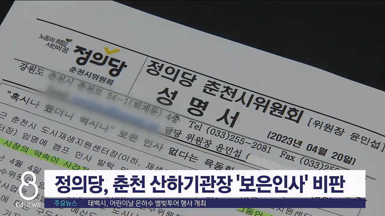 정의당 춘천시위원회는 성명을 내고, "최근 임명된 춘천시 산하기관장 중 일부가 민선8기 춘천시 인수위원회에서 활동한 인사"라며 관련 전문 경력을 찾아볼 수도 없다고 지적했습니다.