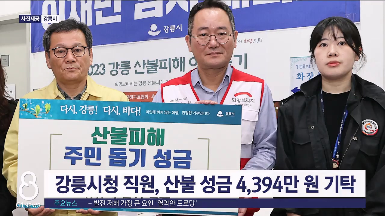강릉시가 산불 피해 주민을 돕기 위한 직원 성금 모금을 모은 4,394만 원을 전국재해구호회에 전달했습니다.