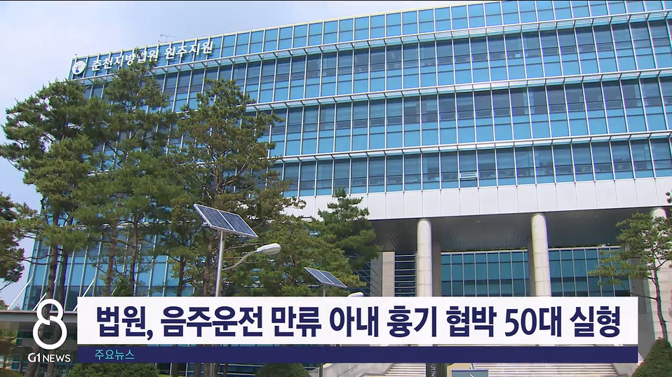 춘천지법 원주지원 형사1단독은 특수협박과 특수폭행, 가정폭력범죄의 처벌 등에 관한 특례법 위반 등의 혐의로 기소된 51살 A 씨에게 징역 1년에 집행유예 2년을 선고했다고 밝혔습니다.