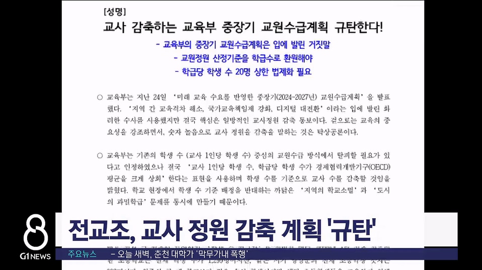 "겉으로는 교육의 중요성을 강조하면서 숫자 놀음으로 교사 정원 감축을 말하는 것은 탁상공론"이라고 규탄했습니다.