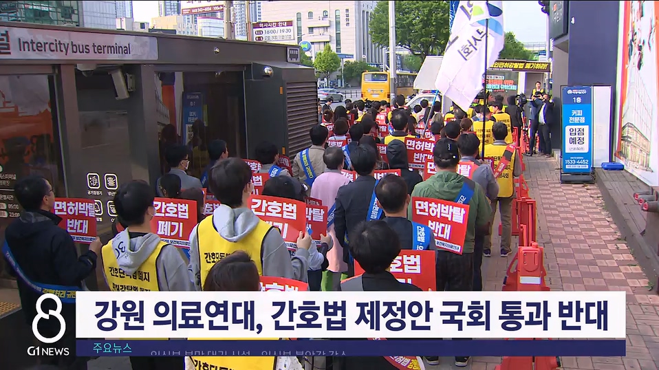 강원도의사회를 비롯해 13개 단체로 구성된 강원 보건복지의료연대가 오늘(3일) 더불어민주당 강원도당 앞에서 간호법 제정안 등의 국회 통과를 반대하는 집회를 열었습니다.
