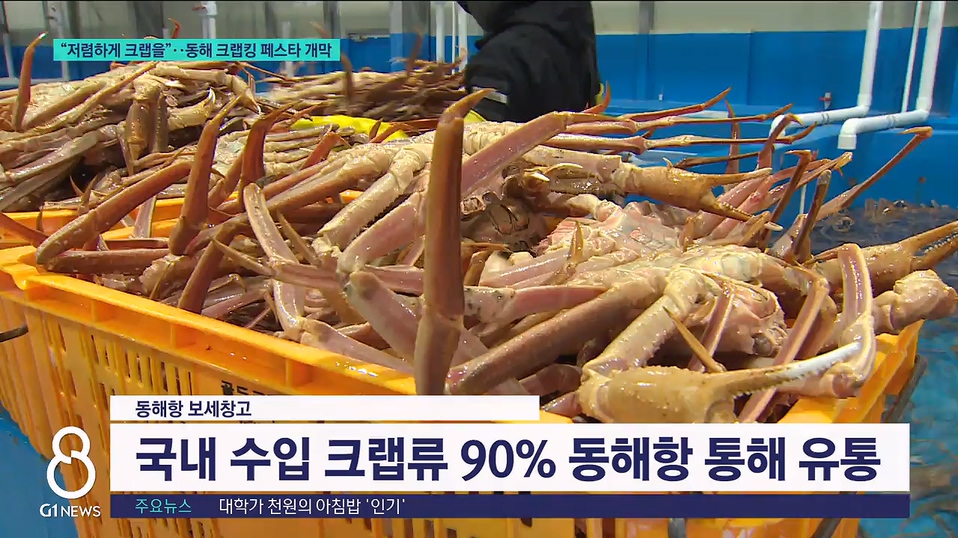 여) 국내에 유통되는 크랩의 90%는 동해항을 통해 들어오는데요. 오늘 G1 뉴스는 크랩킹 축제가 열리는 추암해변 일원에서 행사 소식과 지역 현안을 중심으로 전해드립니다.