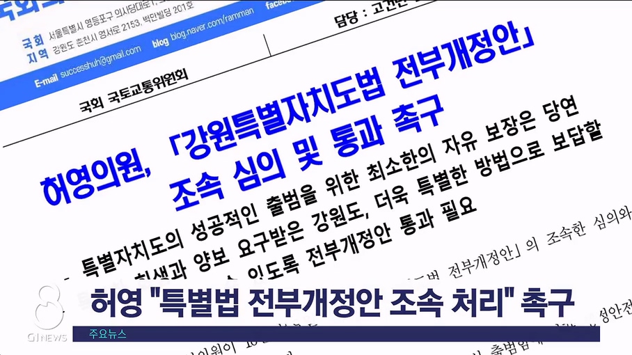 더불어민주당 허영 국회의원이 강원특별자치도법 전부개정안의 조속한 국회 심의와 본회의 통과를 촉구했습니다.