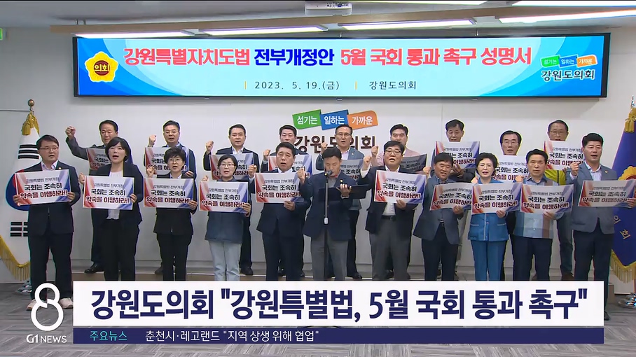 강원도의회가 오늘(19일) 도의회에서 기자회견을 열고 '강원특별법 전부개정안'의 5월 국회 통과를 촉구했습니다.