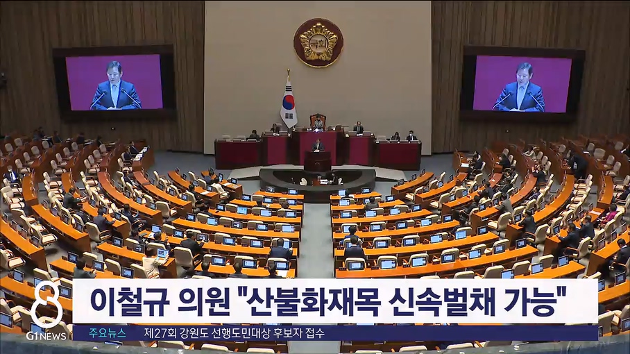 국민의힘 이철규 의원은 산불로 인해 발생한 화재목 벌채 등 산불 2차 피해를 막기 위한 산림사업을 신속히 할 수 있도록 하는 내용의 '산림자원의 조성 및 관리에 관한 법률 일부개정안'이 국회 본회의를 통과했다고 밝혔습니다.