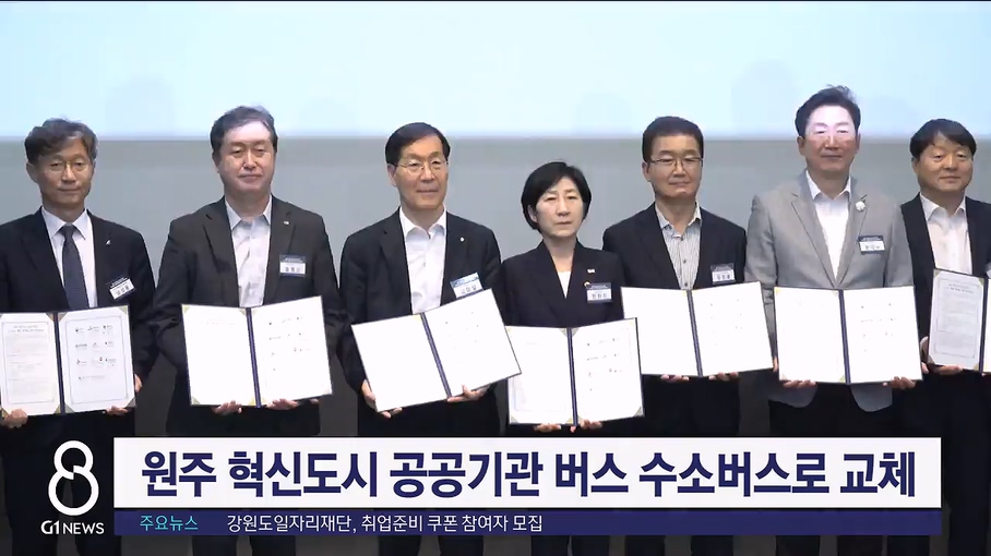 환경부와 강원도, 원주시와 혁신도시 내 공공기관은 오늘(8일) 원주 인터불고 호텔에서 수소버스 전환을 위한 업무 협약을 맺었습니다.