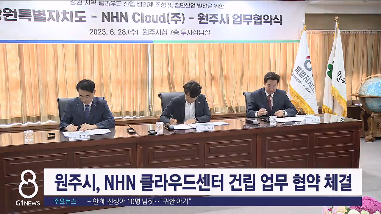 원주시는 오늘(28일) 시청 투자상담실에서 강원특별자치도, 엔에이치엔 클라우드 주식회사와 클라우드 산업 생태계 조성 및 첨단 산업 발전을 위한 업무협약을 체결했습니다.