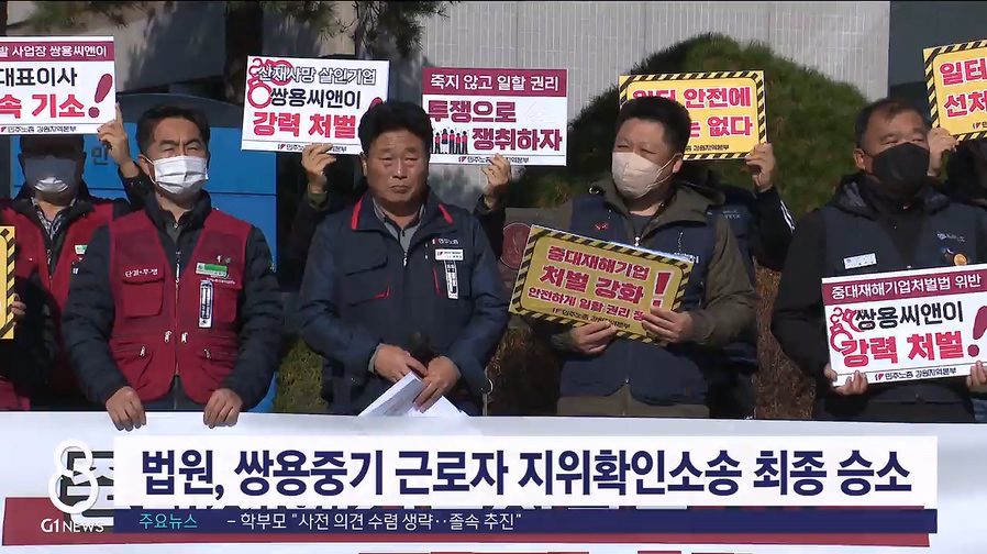 민주노총 강원본부에 따르면, 대법원 2부는 쌍용중기 소속 노동자 14명이 쌍용씨앤이를 상대로 낸 근로자 지위 확인 소송에서 원고 승소로 판결한 원심을 심리불속행 기각으로 확정했습니다.
