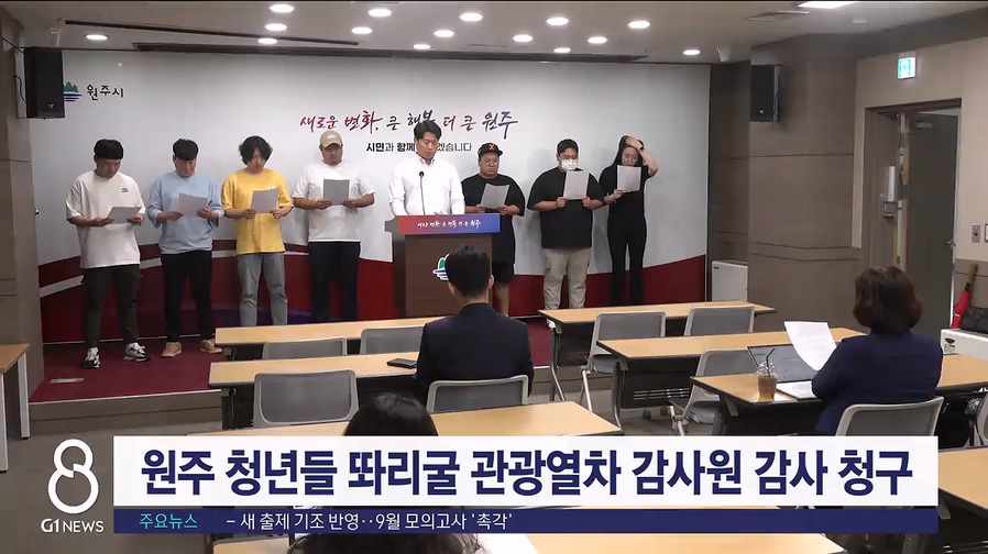 원주를 지키는 청년회 일동은 오늘(11일) 시청 브리핑룸에서 기자회견을 열고, "민선 7기 원주시가 똬리굴 관광 사업을 위해 54억 원을 들여 관광열차 2대를 구입했다"며 "구입 직후부터 지금까지 운행을 못하고 방치해 세금을 낭비했다"고 지적했습니다.