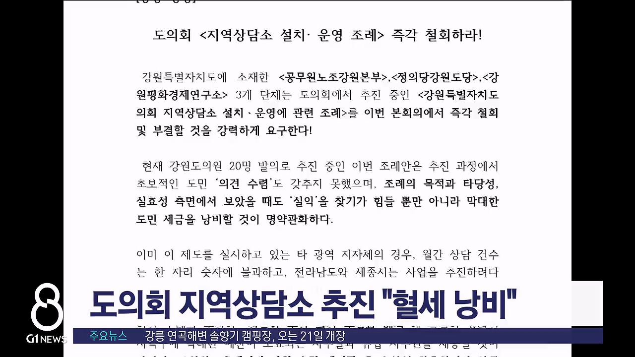 강원특별자치도의회가 신속한 주민 의견 수렴과 해결을 목적으로 추진 중인 지역상담소 설치에 대한 반대의 목소리가 높아지고 있습니다.