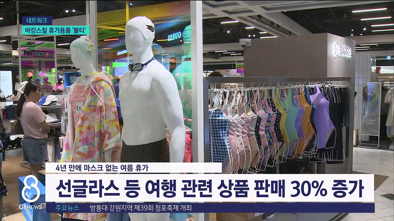 코로나 이후 4년 만에 돌아온 마스크 없는 여름 휴가를 제대로 즐기려는 이들이 크게 늘면서 유통업계마다 관련 용품 매출도 껑충 뛰었습니다.